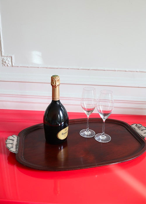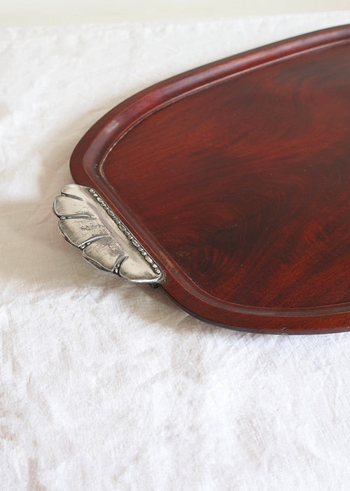 Dans une élégance typiquement Art Déco, les belles poignées de forme coquille en métal argenté de ce plateau s'harmonisent au bois d'acajou sombre. À la fois sobre et raffiné, ce grand plateau apporte une présence chaleureuse et discrète - parfait pour servir comme pour habiller un intérieur.